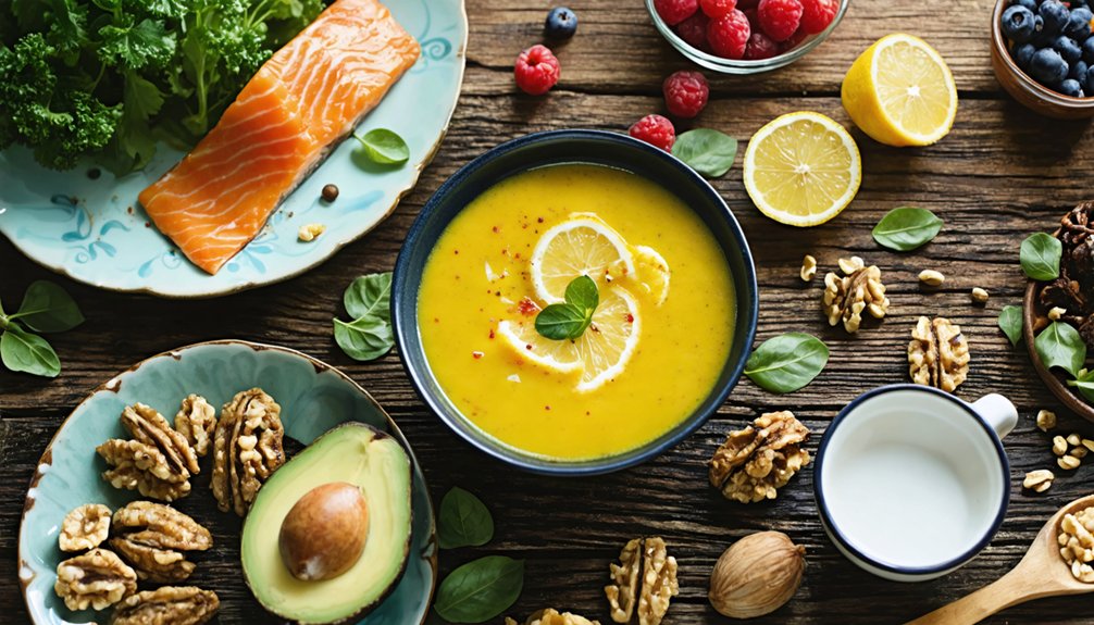 With the mechanisms and biomarkers in mind, you can choose foods that actively lower inflammatory signaling and improve measurable outcomes. Aim to include seasonal berries daily for anthocyanins that reduce inflammatory markers; toss them into chia pudding to amplify fiber and ALA benefits. Use extra virgin olive oil liberallyโits oleocanthal works like a mild anti-inflammatoryโand finish salads and cooked vegetables with it. Make avocado toast a regular ritual: monounsaturated fats, carotenoids, and vitamin E support cellular resilience. Add cruciferous and dark leafy greens for sulforaphane and antioxidants, and eat fatty fish like salmon twice weekly for EPA and DHA. Sprinkle turmeric, ginger, walnuts, and flax or chia seeds to broaden your anti-inflammatory profile and strengthen community-centered meal habits. Recent research shows that diverse plant-based foods supply polyphenols and flavonoids that help counteract oxidative stress. Incorporate omega-3s regularly to support heart health and reduce systemic inflammation. Include a couple of servings of leafy greens daily to maximise vitamin and antioxidant intake.
